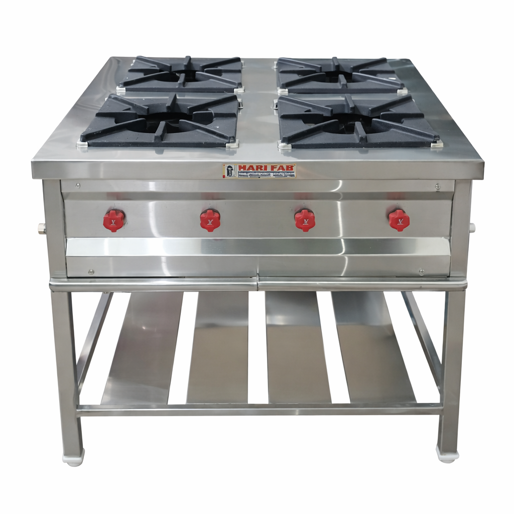 Harifab Kitchen Equipments, we design and manufacture high-performance cooking solutions tailored for professional kitchens. Our Four Burner Commercial Gas Range with Stand is built to deliver efficiency, durability, and consistent cooking performance in demanding environments such as hotels, restaurants, and catering units.